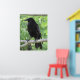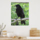 Eine amerikanische Krähe, die in einem Baum gegen grünes Blattwerk sitzt.