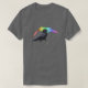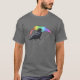 A black crow holds a colorful rainbow banner on this colorful shirt.