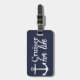 Das Gepäckschild des Kreuzfahrers mit einem weißen Ankerdesign und den Worten "Cruiser for life" in weißem Typografie-Text. Die Rückseite des Tags weist einen großen weißen Anker und einen personalisierten Namen darunter auf.