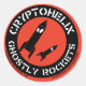 Schwarzes Design auf rotem Hintergrund von Raketen, in Bezug auf den Song "Ghoful Rockets" von der Band Cryptohelix.