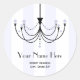 Ein Adressetikett mit einem Hintergrund von hellblauen und weißen vertikalen Streifen. Illustration eines Kristallkronleuchters, der von der oberen Mitte hängt. Personalisieren Sie den schwarzen Text unter Illustration mit Ihrem Namen und Ihrer Adresse. Suchen Sie nach passenden Artikeln wie Porto und Einladungen in Jill's Paperie.