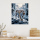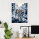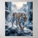 A powerful tiger prowls through an icy canyon, its bold stripes transformed into luminous crystal bands of faceted quartz and pale sapphire light. Gemstone structures along the spine and tail catch the sunrise with subtle rainbow reflections, creating a fierce yet luxurious design. Towering ice walls, drifting mist, frozen streams, and distant mountains enhance the cinematic atmosphere. Striking and unforgettable, this artwork is ideal for bold interiors, tiger lovers, modern spaces, offices, and premium wildlife décor.