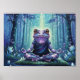 This whimsical poster features a mystical purple frog in lotus pose meditating in an enchanted forest, bathed in glowing light, sparkling fantasy art.