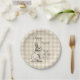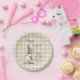 Niedliches handgezücktes Kaninchen und stilisiertes Blume Set auf einem warmen karierten neutralen Creme und beige Gingham. Dieses Design ist vollständig editierbar, sodass Sie die Texte der Happy Oaster Nachricht personalisieren können.