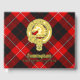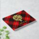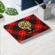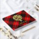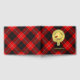Clan Cunningham Wappen Abzeichen umgeben von einem Gurt und Schnalle über Tartan Hintergrund. Benutzerdefinierter Vorder-, Rücken- und Rückentext.