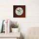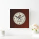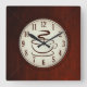 Schöner brauner Holzboden mit Zahlen und einer Tasse dampfenden Kaffee auf einem mittleren Kreis. Vollständig anpassbar, Elemente hinzufügen/entfernen oder diese quadratische Uhr mit Text personalisieren.
