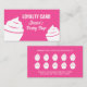 Cupcake Konditorei Punch-Kartenvorlage. Individuelle Prämie-Kartengestaltung für den Cup Kuchen-Shop und vieles mehr. Anpassbare heiß-rosa Farben. Platz für 10 Briefmarke / Lochbohrungen. Bieten Sie Kunden und Kunden einen Rabatt oder kostenlose Bestellung. Zweiseitig bedruckt mit Desserts.