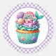 Round sticker is shown with a cute cupcake birthday space mermaid print.