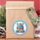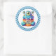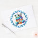 Round sticker is shown with a cute cupcake birthday blue monster print.