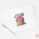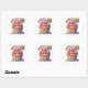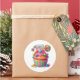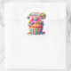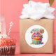 Round sticker is shown with a cute cupcake birthday candy treats print.