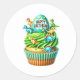 Round sticker is shown with a cute cupcake birthday dinos print.
