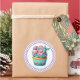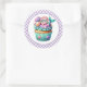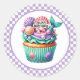 Round sticker is shown with a cute cupcake birthday space mermaid print.