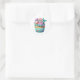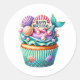 Round sticker is shown with a cute cupcake birthday mermaid print.