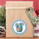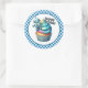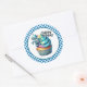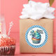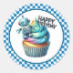 Round sticker is shown with a cute cupcake birthday robot print.