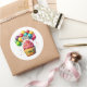 Round sticker is shown with a cute cupcake birthday balloons print.