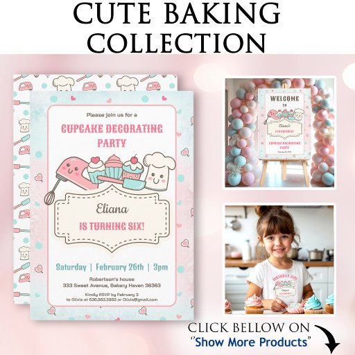 Niedlicher "Cupcake Decorating Party" T - Shirt für Mädchengeburten, mit bezaubernden Backmotiven in Rosa, Blau und Creme. Ideal für eine lustige und kreative Geburtstagsfeier. Personalisieren Sie den Text einfach. Kate Eden Art