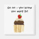 Ein quadratischer, weißer Kühlschrankmagnet mit einem üppig aussehenden Schokoladenkuchen, überzogen mit Creme und Erdbeere, aus einer handbemalten Papierkollektion von Judy Adamson. Die Worte über dem Kuchen lauten: "Los, du weißt, du will dir!" in schwarz. Der perfekte Kühlschrankmagnet, um die Entschlossenheit eines jeden Dieters zu testen! Dieser Kuchen ist auch auf einer Grußkarte und einem Damenspaghetti-T - Shirt erhältlich.