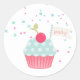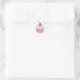 Ein niedlicher Aufkleber für Umschläge oder Gastgeschenk-Taschen ist mit einem rosa und blauen Kuchen mit einer Kirsche oben und auf Herz und Punkt Konfetti versehen.