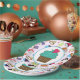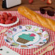 Set von acht 9" Papier Tellern mit einem Bild von skurrilen Kuchen auf rosa, hinter einem weißen Zentrum mit türkisfarbenem Rand und einem Bild eines Schokoladenkuppchens mit aquamarinem Eis überragt mit einem roten Herz. Siehe dazu passende Süßigkeiten, Espressotasse, Krug, Teekanne und Untersetzer. Sehen Sie sich die gesamte Kids' Corner Plate Kollektion im NAHRUNGSMITTEL/BEV an. | Abschnitt Geschirr.