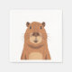 Eine charmante Abbildung einer Capybara, die direkt nach vorn blickt, mit einem ruhigen und sanften Ausdruck. Das Bild zeigt die einzigartigen Merkmale der Capybara, einschließlich ihres runden Gesichts, ihrer ausdrucksvollen Augen und ihrer unverwechselbaren Whiskers. Der minimalistische Stil und die erdigen Farbtöne verleihen dem Hotel ein sehr ansprechendes Aussehen, das für die Liebhaber von Tieren visuell ist.