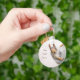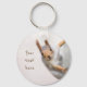 Closeup front view of a squirel on a tree trunk, looking straight at you. Funny and curious animal. Squirrel symbolises practicality, the necessity to make pleriminary provisions. Keychain. You can change or delete the image and the template text.