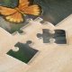 Schöne tropische Regenwaldszene, mistige Bäume, fantastische Schmetterlinge und eine bunte, geschwungene Aracari-Toucan fängt das Sonnenlicht auf seine Federn. Originelle Kunst, digitale Malerei von Erin Cooper.