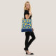 Tote Tasche mit einem ogee Fliesenmuster mit Curling Felsen in den Farben blau und gelb auf weißem Hintergrund. Ideal für Curler und Curling-Fans.