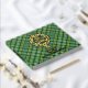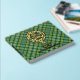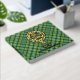 Clan Currie Hahn Wappen Abzeichen umgeben von einem Gurt und Schnalle über Tartan Hintergrund. Benutzerdefinierter Vorder-, Rücken- und Rückentext.