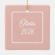 The reverse side offers a clean, sophisticated design on a matching pink background, featuring customizable text for a name and year (e.g., "Olivia 2026") framed in a minimalist white border. Whether hanging on a holiday tree or displayed year-round on an ornament stand, this high-quality ceramic piece is a timeless way to celebrate a new mom’s journey. It makes a thoughtful sentimental gift for first-time mothers, grandmothers, or a unique "baby's first year" memento.