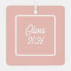 The reverse side offers a clean, sophisticated design on a matching pink background, featuring customizable text for a name and year (e.g., "Olivia 2026") framed in a minimalist white border. Whether hanging on a holiday tree or displayed year-round on an ornament stand, this high-quality ceramic piece is a timeless way to celebrate a new mom’s journey. It makes a thoughtful sentimental gift for first-time mothers, grandmothers, or a unique "baby's first year" memento.