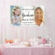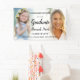 Elegantes und modernes Drehbuch-Abschluss-Banner personalisiert mit dem Text "Glückwunsch an unseren Absolvent" und ein vor und nach dem Foto Collage der Person als Kind auf der links und eine neuere als Absolvent auf der rechten Seite. Nutzen Sie dieses Willkommensschild für ein Party in der Oberschule oder im Uni-Abschluss oder lassen Sie sich von außen beglückwünschen. Um die Platzierung des Fotos zu ändern: Klicken Sie auf die Schaltfläche, um es weiter anzupassen, klicken Sie auf "Zuschneiden" und verschieben Sie das Bild.