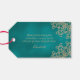 Eine schöne aquamarine blaugrüne und goldene Hochzeit danke Ihnen ein Geschenktag mit einem exotischen indischen inspirierten Ziersari MEDALLION Muster MIT EINEM FLORAL UND LOTUS SUNBURST DESIGN. Diese elegante und schöne Hochzeit im indischen Stil lädt zu jeder Art von Anlass mit einem OSTASIATISCHEN INDONESISCHEN MOROKANISCHEN ALADDIN oder ARABIAN NIGHTS THEME ein. Designed by Chrissy H. Studios, LLC. Alle Rechte vorbehalten.
