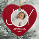 Dieses stilvolle, herzförmige Baby's First Christmas Foto Ornament ist mit dem Wort JOY auf einem roten Hintergrund dekoriert. Einfach mit Foto, Name und Jahr anpassbar.