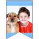 Coole personalisierte bunting Fahne Dekoration in blau für einen jüdischen Jungen Bar Mitzvah. Dieses niedliche Judaismus-Fest-Banner zeigt den David-Stern in jeder Ecke. Passen Sie sich mit einem Baby und aktuellem Bild Ihres Jungen an.