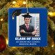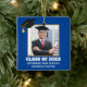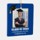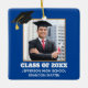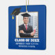 Dieses maßgeschneiderte blaue goldene Senior Graduate Weihnachtsschmuck zeigt Ihr Abschluss Foto unter einem schwarzen Graduierdeckel. Personalisieren Sie Ihre Unterrichtszeit, Schule und nennen Sie ein tolles Geschenk für einen geschlossen Schüler.