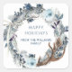 Herrliches Umschlag Aufkleber- oder Geschenketikett mit exquisitem Aquarellkranz mit Blume, Blattwerk und Band in Blau, Silber und Weiß. Zwei Textabschnitte im Kranz für Ihre benutzerdefinierte Nachricht und Ihren eigenen Namen. Sammlung mit koordinierenden Produkten