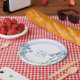 Detaillierte Aquarellmalerei von blauen Speedwell Veronica Wildblumen Blumenpapier-Einwegplatte. Personalisieren Sie mit dem Namen Ihrer eigenen Braut und Bräutigam. Teil des temperamentvollen blumengeschmückten Set, entworfen und adaptiert von der originalen Aquarellmalerei von Sarah Trett. www.sarahtrett.com