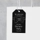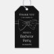 Bachelor-Party dankt Ihnen Geschenkanhänger in Schwarz mit weißem Text und einer stilvollen minimalen Bogen-Krawatte Illustration. Personalisieren Sie es mit dem Namen und dem Datum der Veranstaltung, um den Bräutigam zu feiern.