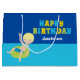Kinderschwimmbad Happy Geburtstag Geschenktasche für ein blondes Kind im Schwimmteam während des Sommers. Ein heller, lustiger Pop mit Farbtupfern und ein cooler Schwimmjunge in einem Schlauch. Für ein besonderes Kindergeschenk.