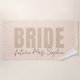 Feiern Sie die Braut mit diesem personalisierten und stilvollen Strandtuch in rosa! Mit fett gedruckten BRIDE-Schriftzeichen und dem zukünftigen Nachnamen der Braut in schicker Schrift ist dieses Handtuch ein Muss für Junggeselinnen-Abschied, Brautpartys, tropische Flitterwochen oder Hochzeitswochenenden am Strand.