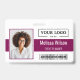 This modern horizontal design achieves maximum impact and clarity with a striking white background accented by a bold stripe of deep berry red. The layout smartly positions the employee's photo on the left and prominently displays your company logo above the name and title for quick identification. Complete with a lower section dedicated to a barcode or QR code, this vibrant and highly organized style is perfect for streamlined event management and corporate access.