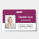 This badge features a bold and eye-catching color block design, dominated by a rich, vibrant magenta or deep berry hue on the top half, perfectly contrasted with a clean white lower section. The layout includes a sharp, framed area for a professional photo and a designated space for your logo, ensuring instant recognition. This high-impact, modern aesthetic gives your team a standout, memorable look that is both professional and fashion-forward.