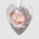Passen Sie dieses herzförmige Ornament mit zwei wertvollen Fotos an, um der Geburt oder der ersten Weihnachtszeit Ihres Babys zu gedenken. Ihre eigenen Bildunterschriften erscheinen vorne und hinten in weißer Hand mit Buchstabenschrift im Stil der Pinseltypografie.