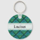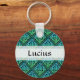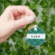 Eine runde Schlüsselkette eines blau-grünen keltischen Knotens wiederholte Diamantfliesen-Design vor einem schwarzen Hintergrund mit anpassbarem Namen in der Mitte.