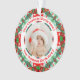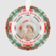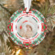 Custom Pretty Circular Family First Christmas Photo Gift Hanging Ornament. In festive colors of red and green. A bold, round border surrounds the picture in the middle. Replace the photo with a picture of your own beautiful new baby boy or girl, family member, couple, or best friend. Personalize this by changing the words and picture. Give as a present for family at Christmas. Mama, mom, mam, mammy, mommy, mother, and your wife will love hanging up this gift decoration to celebrate the birth of their new baby and their first Christmas. In a lovely mixture of bright and merry colors.