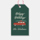 Ein personalisierter Weihnachtsgeschenktag mit niedlichem Retro, Rotbahnwagen und Kanubild. Dieser Artikel kann mit Ihrer persönlichen Nachricht oder Ihrem Urlaubsgruß angepasst werden. Die Farben sind in den traditionellen Weihnachtsfarben grün, rot und weiß gehalten.
