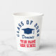 Custom Class of 2025 High School Abschlussfeier Paper Cups. Personalisieren Sie mit Ihrem eigenen Namen. Doppelsiegreicher Druck mit dem Logo der Sockelkappe. Party für Graduiertenfeiern erhältlich. Die Farben Blau und Rot sind individuell einstellbar.