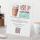 Mit diesem auffälligen Podestschild werben Sie für Ihre Coffee Shop-Belohnungen! Mit einem modernen Design und einem Aquarelltasse-Kunstwerk ermuntert dieses benutzerdefinierte Schild zu wiederholten Besuchen mit dem lustigen Slogan "Perk Up! Du verdienst Belohnungen." Dieses Schild eignet sich ideal für den Einsatz in Counter, Point-of-Sale-Bereichen oder Café-Eingängen. Es unterstreicht Ihr Treueprogramm und bietet Platz für einen QR-Code, um mit digitalen Belohnungen, Menüs oder Anmeldeformularen zu verbinden. Eine stilvolle und funktionelle Ergänzung zu Ihrem Coffee Shop-Dekor, die die Verlobung und Markenloyalität Ihrer Kunden stärkt.