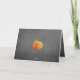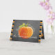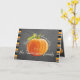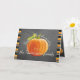 Cute 'Thanksgiving Greetings' text written in pretty typography, an orange Pumpkin on trendy blackboard background, surrounded by bright orange, lime green, white and black stripes pattern design. With room to customize the greeting on the font, and personalize with your family or corporate company name and foto of your choice on the inside. Tipp: Turn this card into, Foto von Display by folding it inside out.