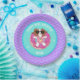 Auf dieser individuell gestalteten Geburtstagsfeier präsentiert sich Sophie, ein brauner und weißer Cartoon-Hund, der sich auf einem aufblasbaren Schwimmbecken in Form einer Donuts entspannt. Sophie trägt eine Sonnenbrille und trägt einen rosa Badeanzug mit Ananas-Design. Party-Teller haben ein gewelltes Muster und Glitzern als Akzente. Das Party ist in Aquarelltönen gehalten, lila, hell rosa, weiß und minzgrün.